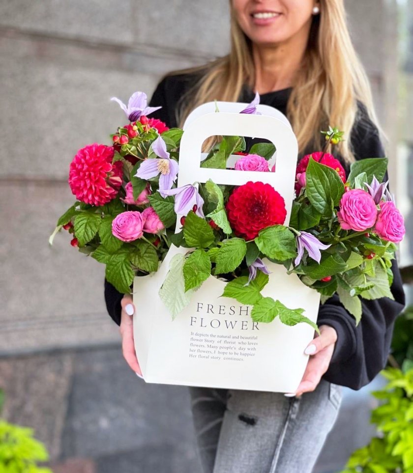 Корзина цветов — георгины, клематисы и пионовидные розы