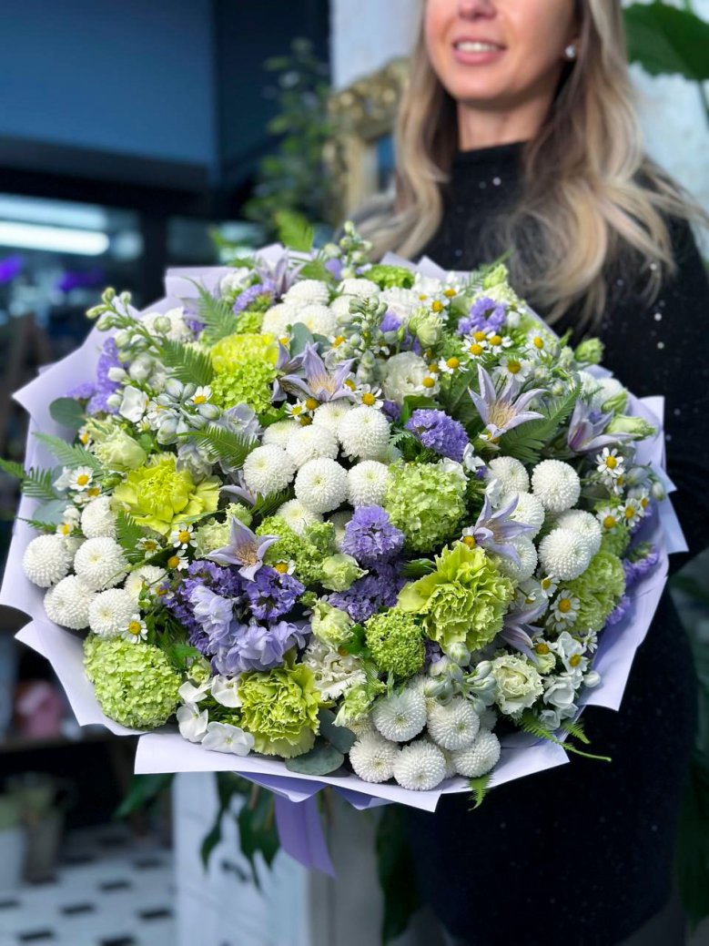 Авторский букет цветов — дельфиниумы, сантини, гвоздики и душистые флоксы