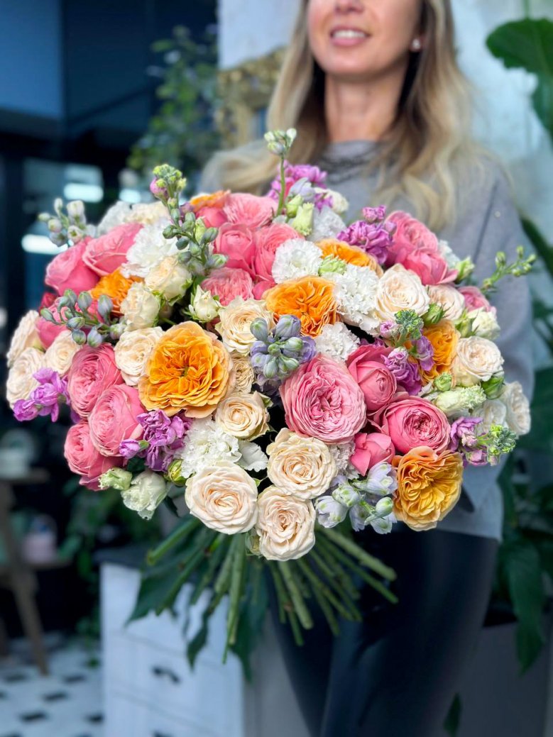 Авторский букет цветов — пионовиднве и садовые розы, дельфиниумы и маттиолы