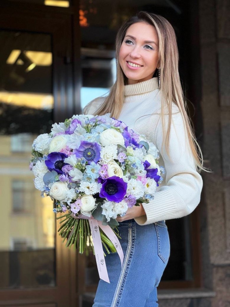 Авторский букет цветов — ранункулюсы, анемоны, флоксы и дельфиниум