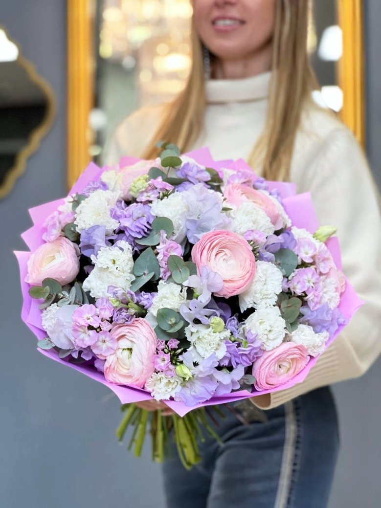 Авторский букет цветов — ранункулюсы, лавандовые розы, маттиола и душистый горошек