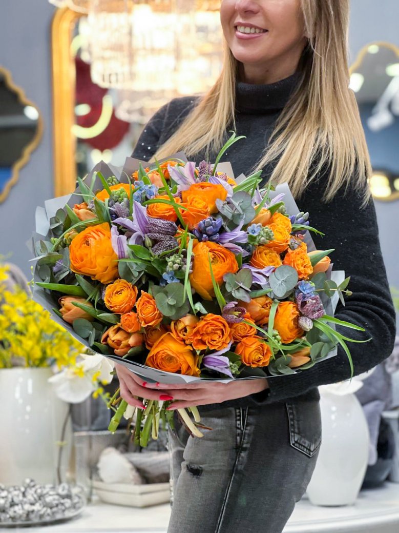 1. Каждый букет уникален и имеет сезонность, поэтому он может отличаться от того, который вы видите на картинке. Мы можем создать композицию в подобном стиле и цвете.