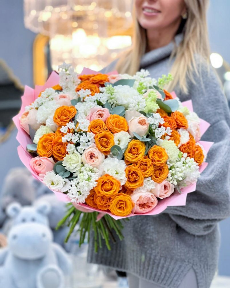 1. Каждый букет уникален и имеет сезонность, поэтому он может отличаться от того, который вы видите на картинке. Мы можем создать композицию в подобном стиле и цвете.