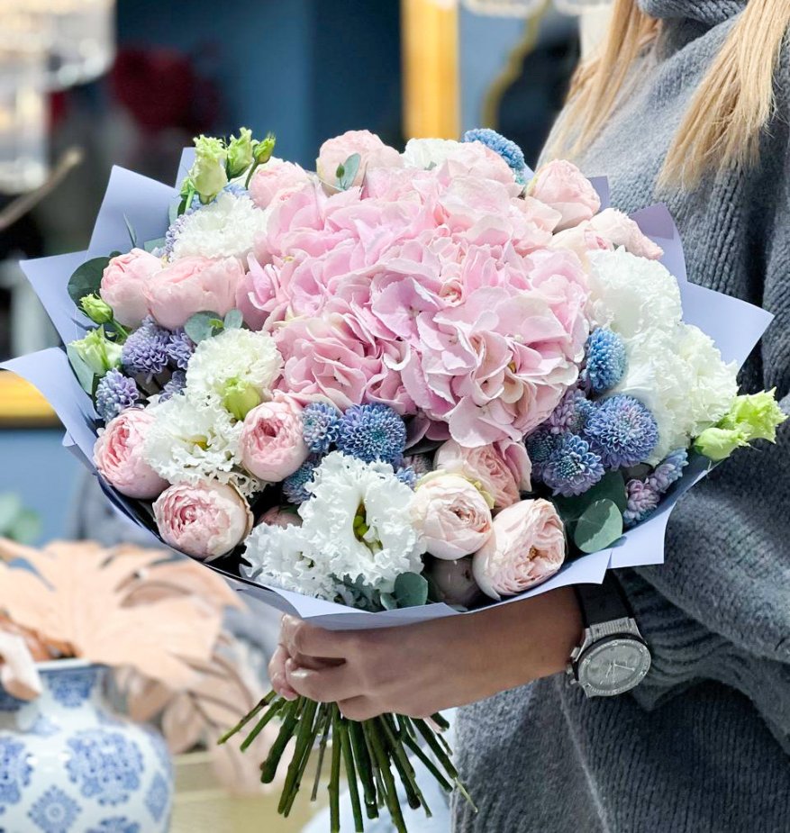 Букет цветов — гортензия, голубые сантини и пионовидные розы