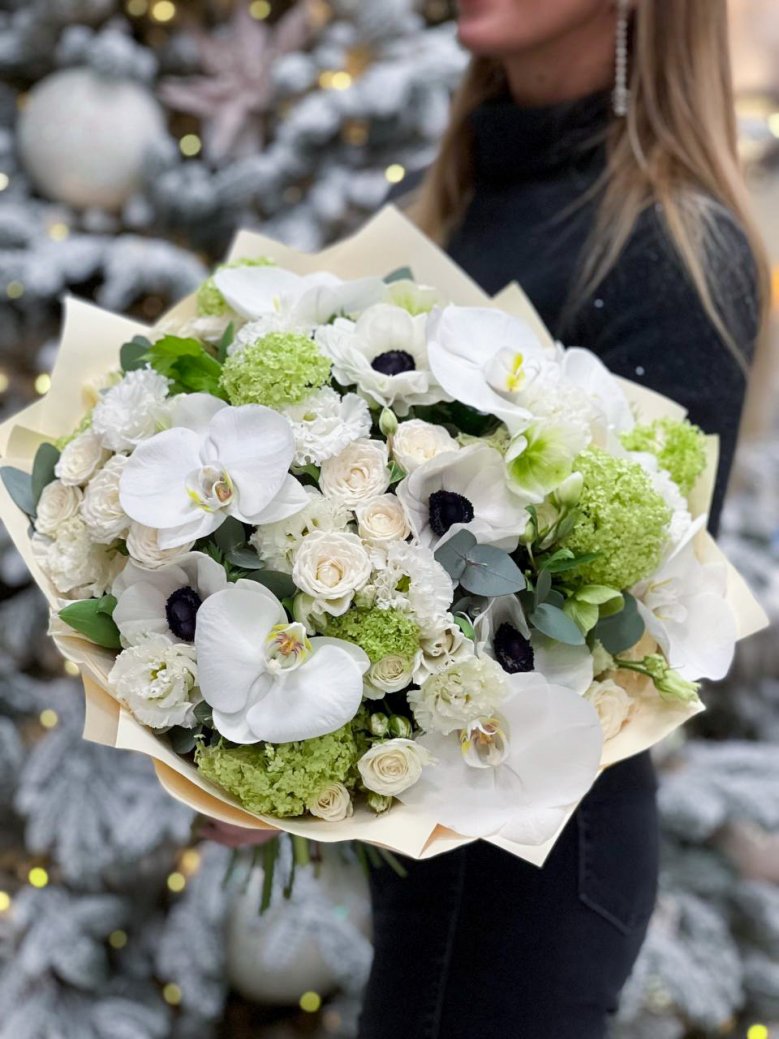 1. Каждый букет уникален и имеет сезонность, поэтому он может отличаться от того, который вы видите на картинке. Мы можем создать композицию в подобном стиле и цвете.