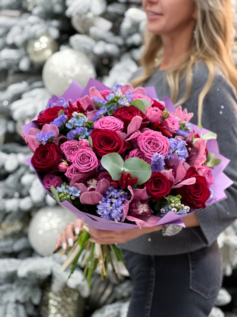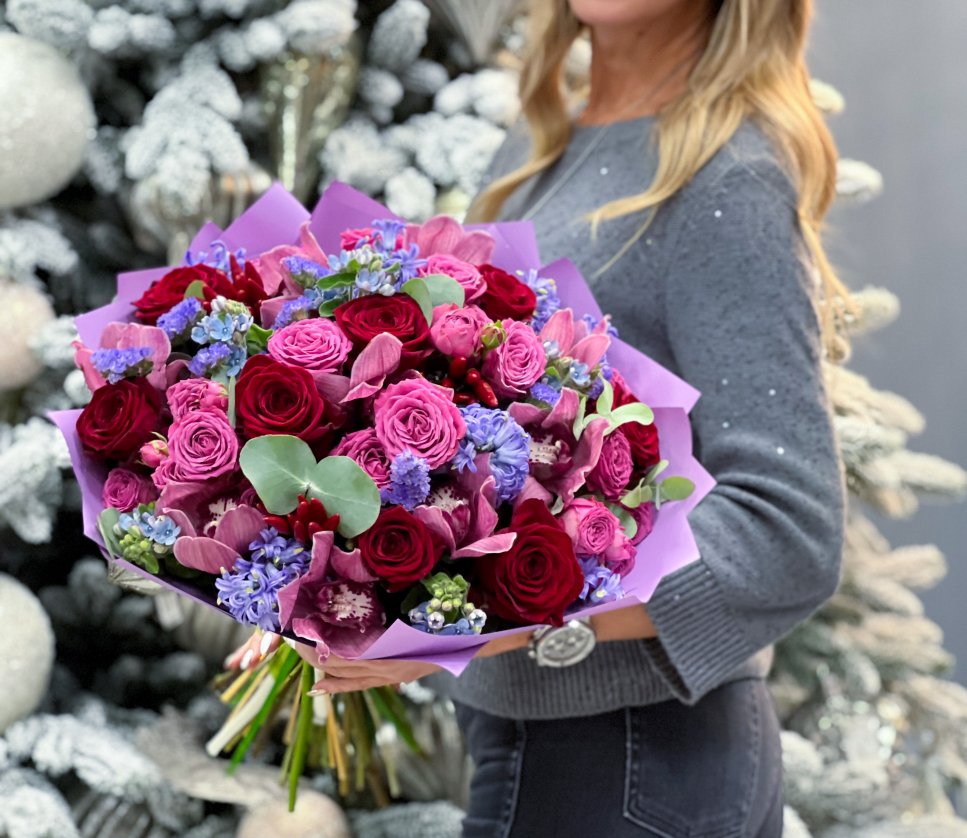 Букет цветов — пионовидные розы, орхидеи и гиацинты