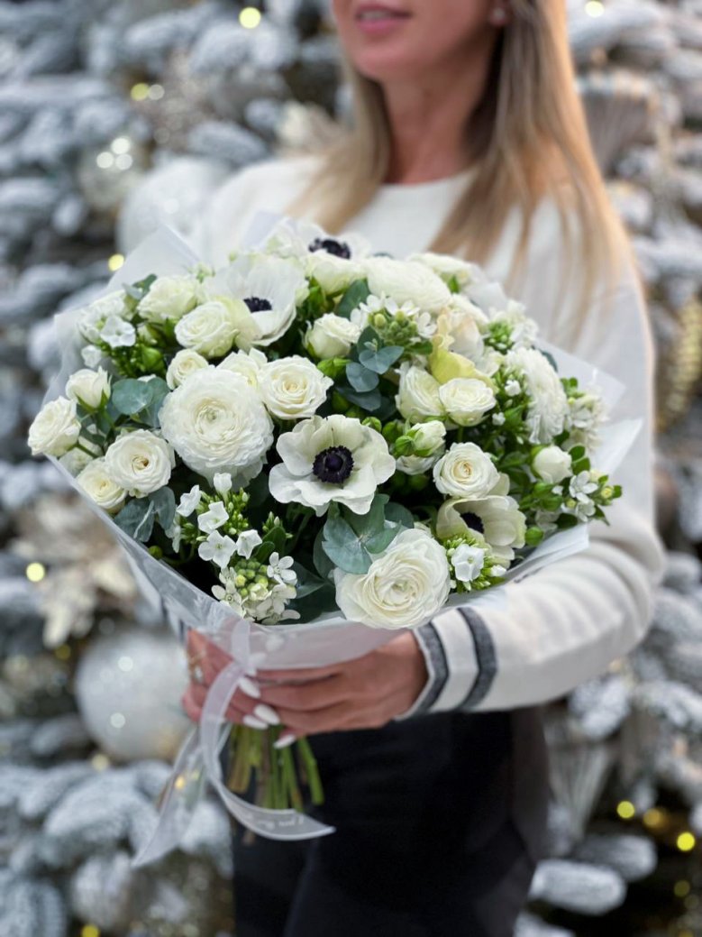 Состав: белоснежный ранункулюс, оксипеталум, анемон, кустовая роза и флокс