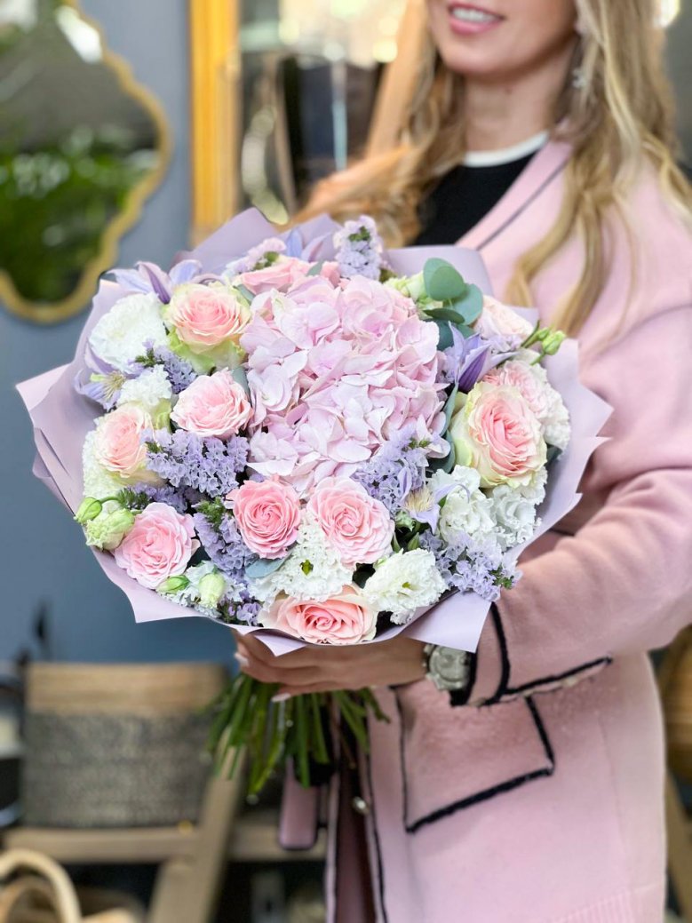 Состав: гортензия, пионовидная и садовая роза, статица и клематис