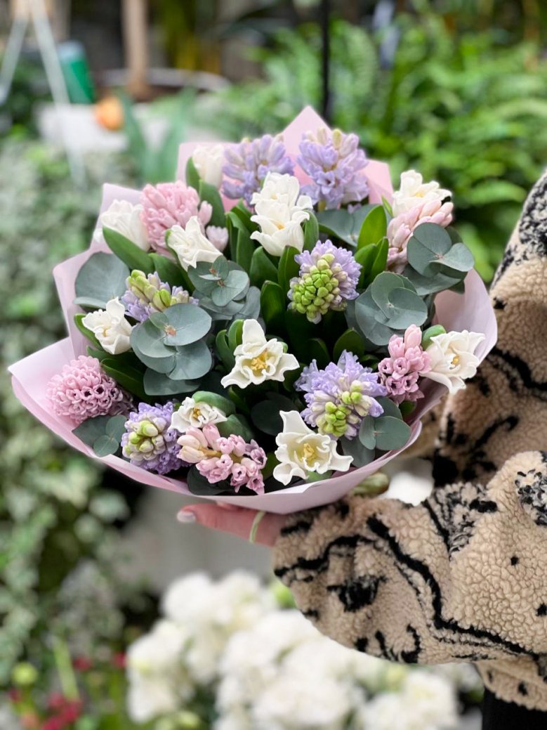 Букет цветов — тюльпаны, гиацинты и эвкалипт