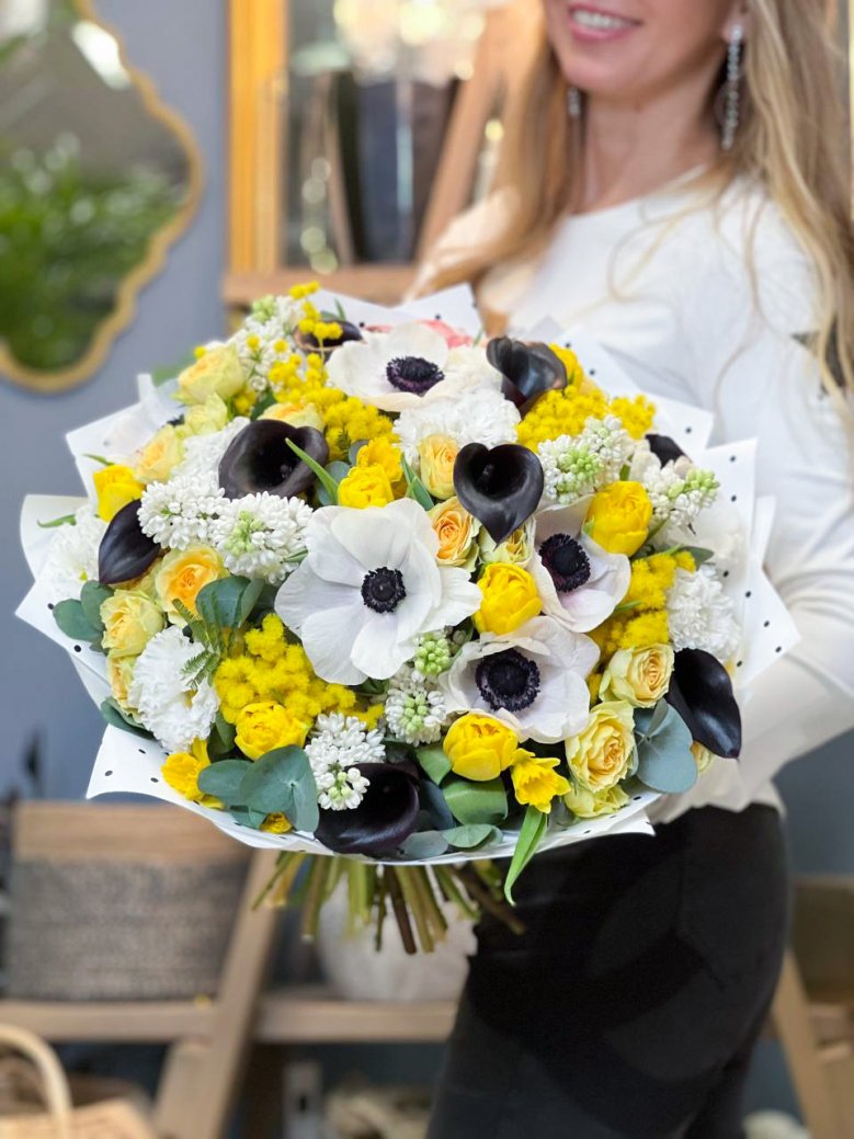 1. Каждый букет уникален и имеет сезонность, поэтому он может отличаться от того, который вы видите на картинке. Мы можем создать композицию в подобном стиле и цвете.
