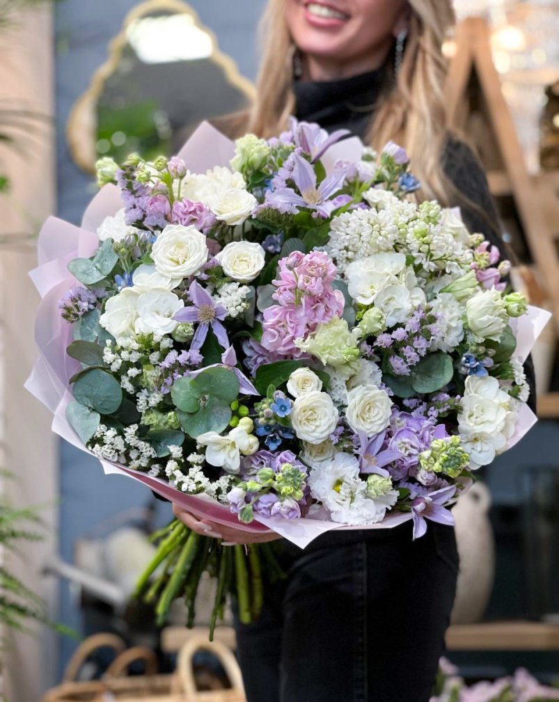 Букет цветов — маттиолы, фрезии, оксипеталумы и статицы