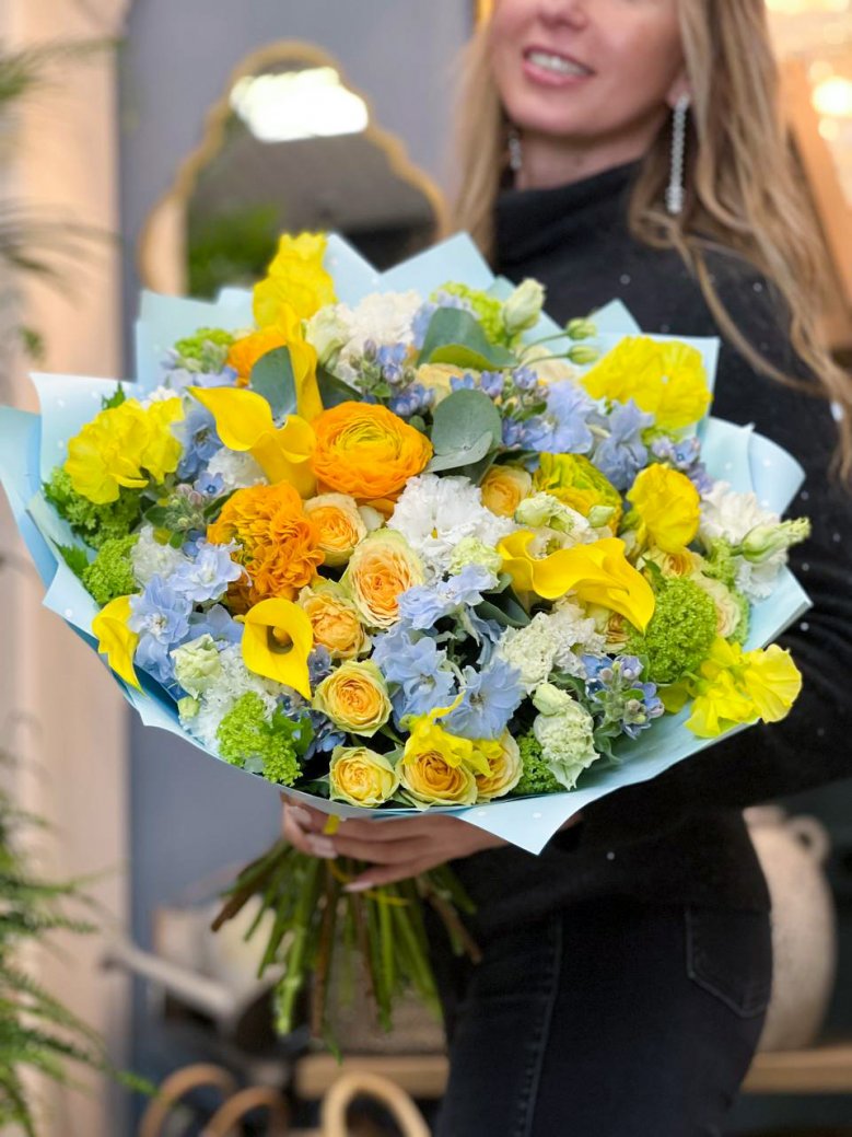 1. Каждый букет уникален и имеет сезонность, поэтому он может отличаться от того, который вы видите на картинке. Мы можем создать композицию в подобном стиле и цвете.