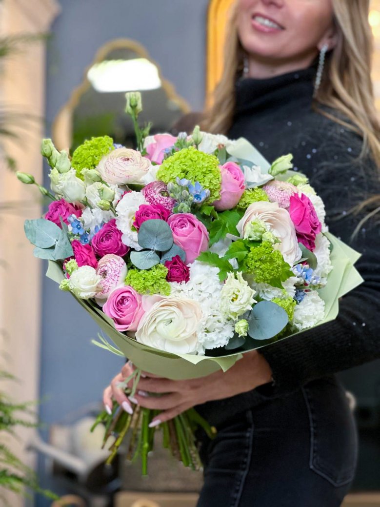 Букет цветов — пионовидные розы, вибурнумы, ранункулюсы и оксипеталумы