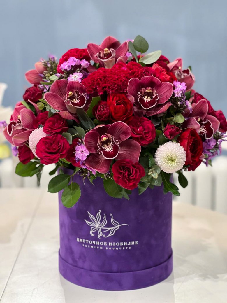 Композиция в коробке — орхидеи, пионовидные розы, флоксы и целозии