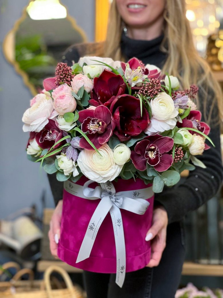Композиция в шляпной коробке — ранункулюсы, амариллисы, орхидеи, фритилярия и скимия