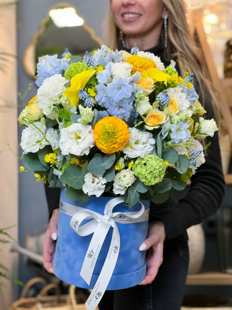 Композиция в шляпной коробке — дельфиниумы, ранункулюсы, каллы, мускари и розочки