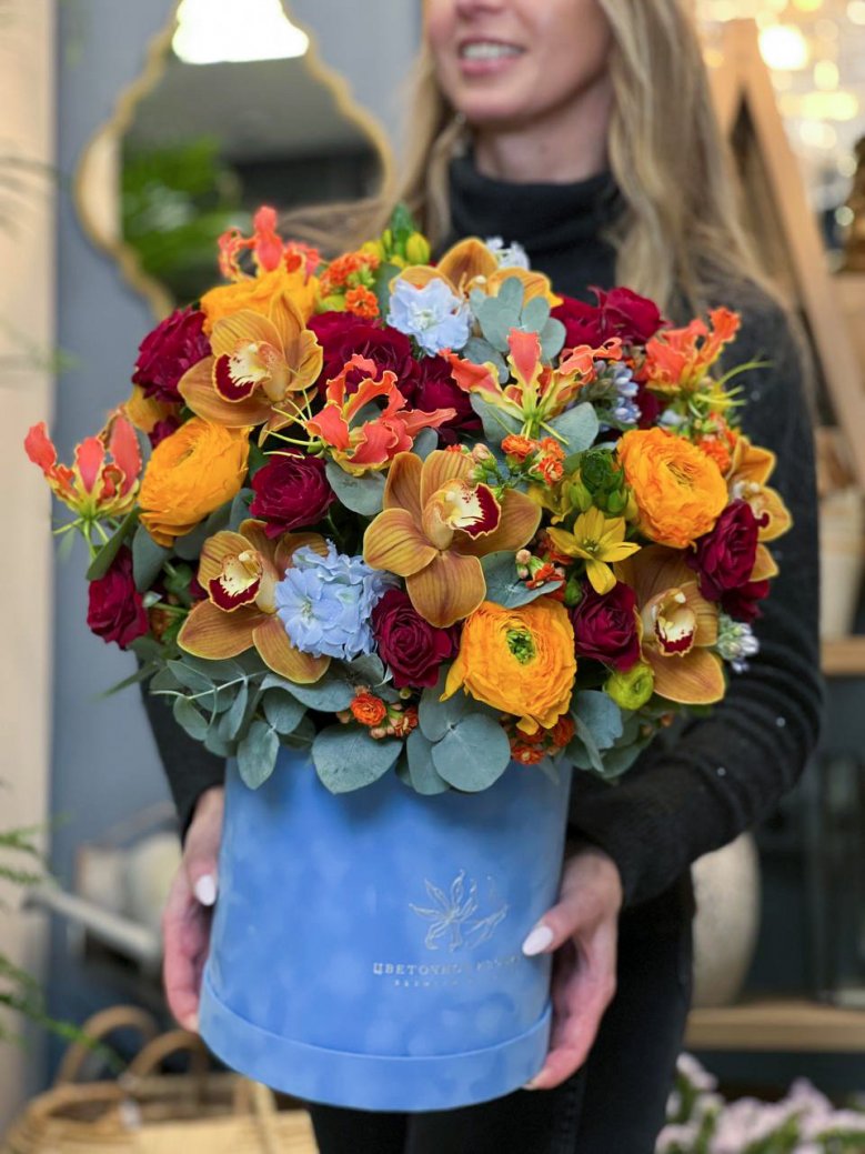 Композиция в шляпной коробке — дельфиниумы, ранункулюсы, глариозы и садовые розы