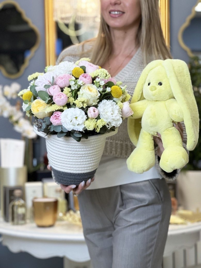 Flower box — пионовидные розы нежно-желтого и розового цвета, оксипеталумы и краспедии
