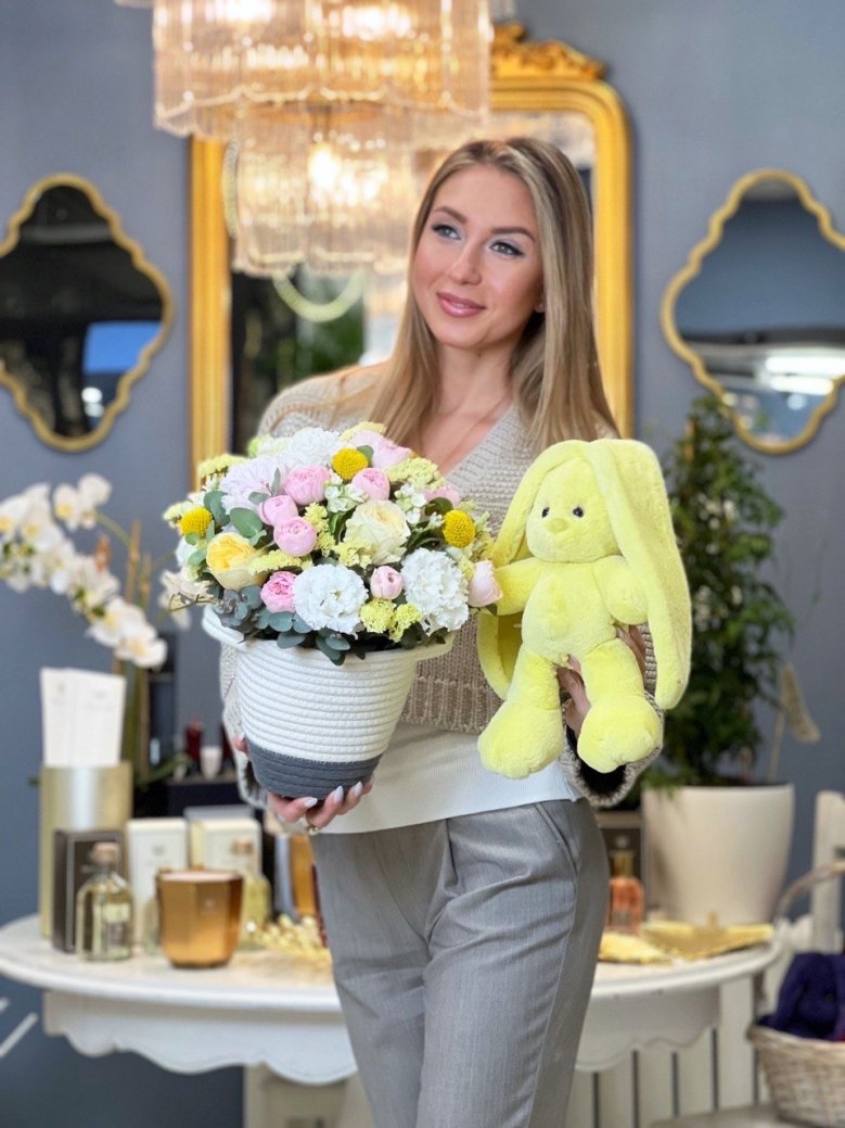 Авторский букет цветов — матрикарии, тюльпаны, нарциссы, вибурнум и лизиантусы
