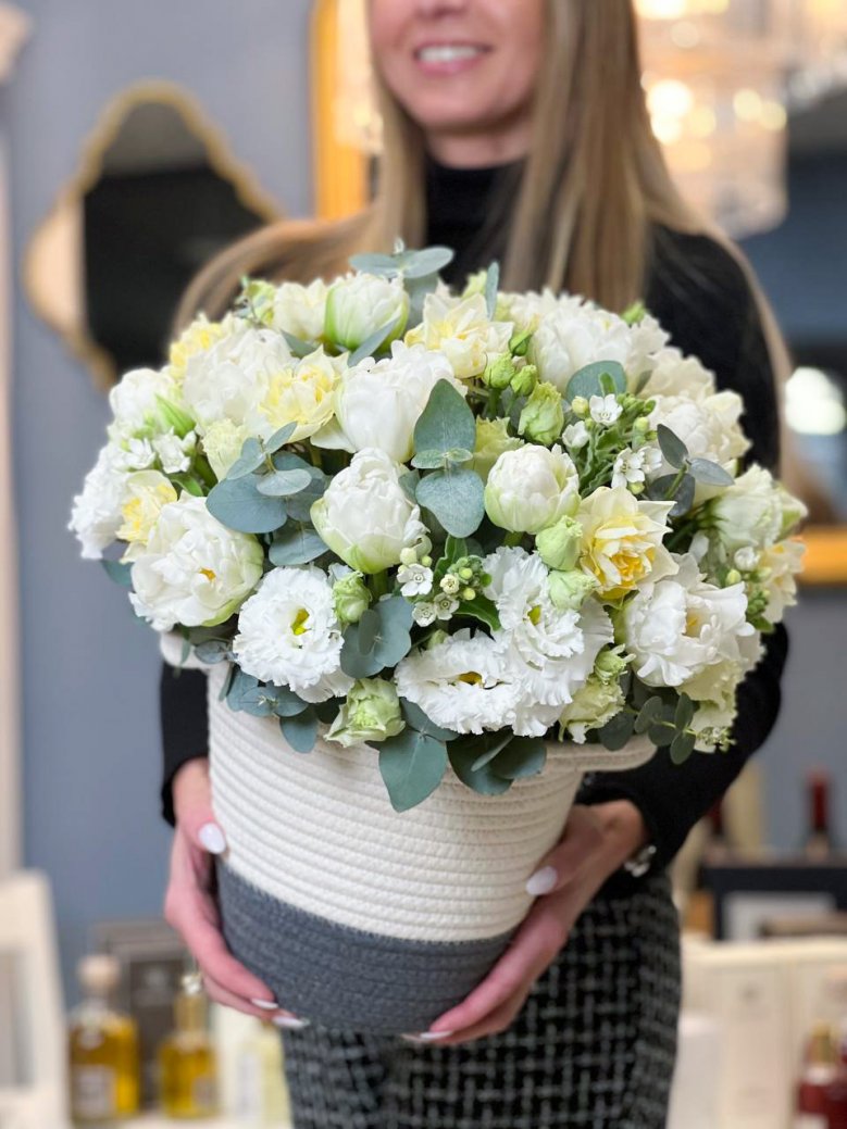 Корзиночка цветов — пионовидные розы, эустомы, ранункулюсы и хелеборум