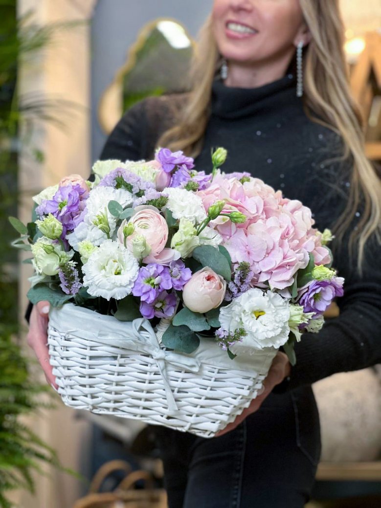 Корзина цветов — гортензия, маттиолы и пионовидные розы