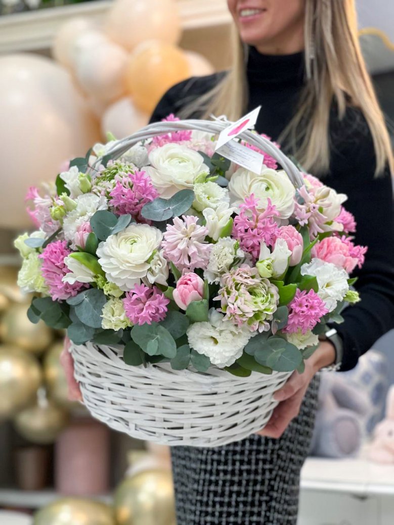 Корзина цветов — гиацинты, ранункулюсы, тюльпаны и эустомы