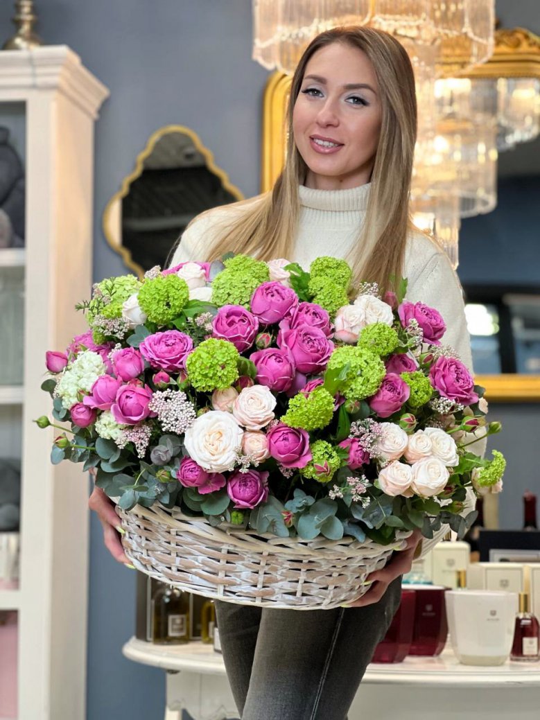 Корзина цветов — пионовидные розы, вибурнумы и озомантусы