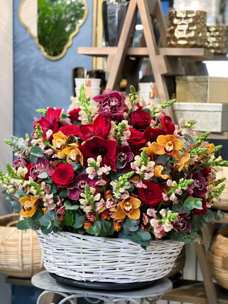 Корзина цветов — орхидеи, амариллисы, антирринум и садовые розы