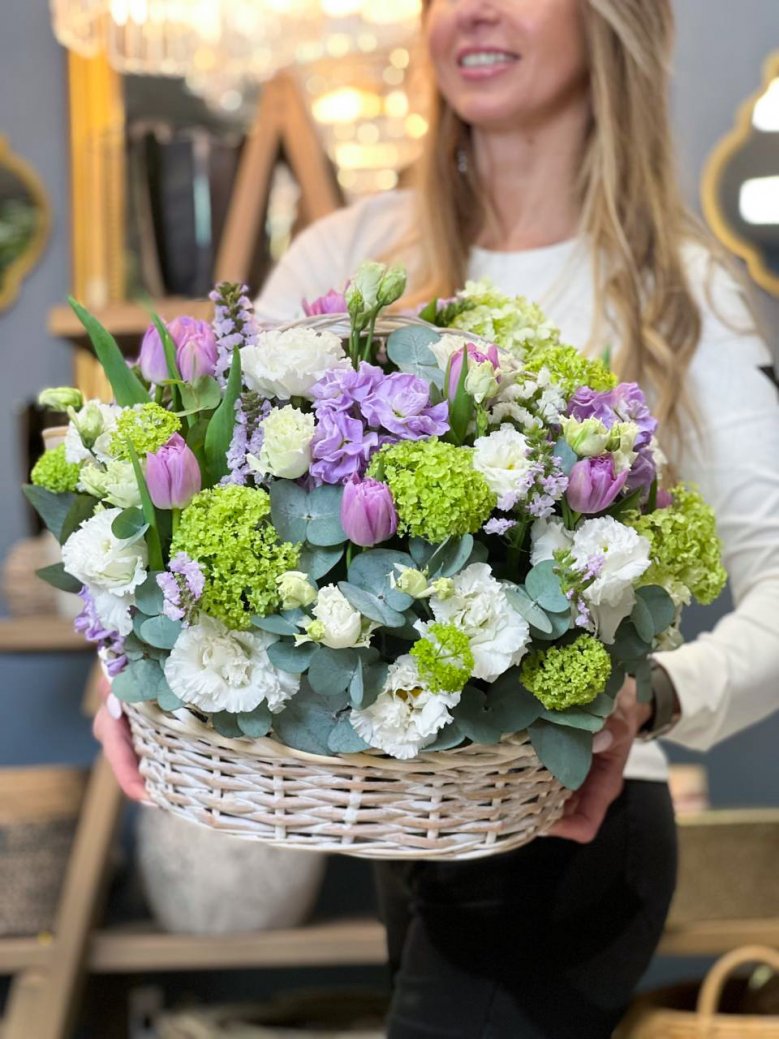 Корзина цветов — маттиолы, тюльпаны, вибурнумы и эустомы