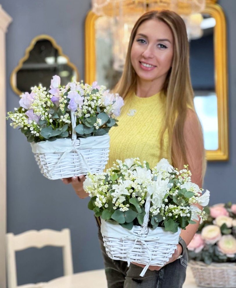 Корзина цветов — ландыши, душистый горошек и эвкалипт