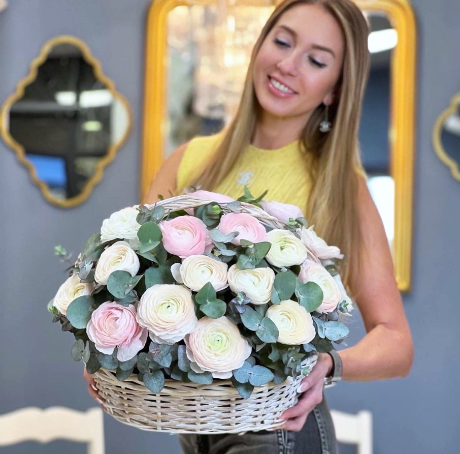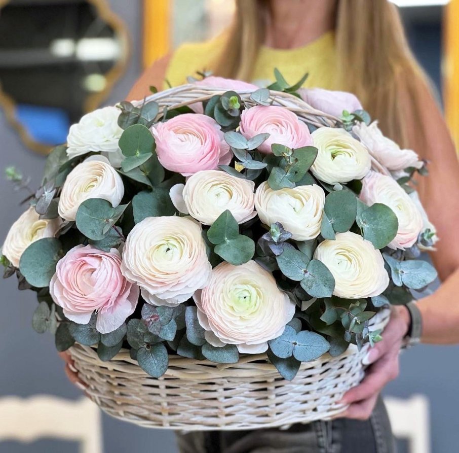 Букет цветов — пионовидная роза, кустовая садовая роза, сантини, ежевика и зелень