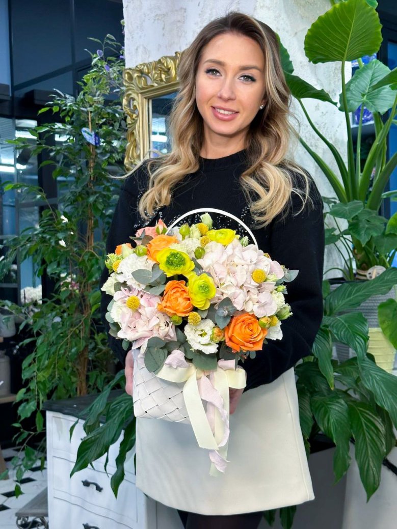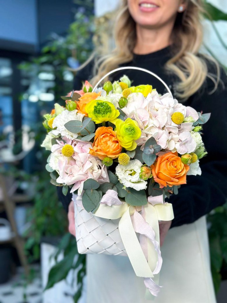 Корзинка цветов — гортензии, ранункулюсы, пионовидные розы